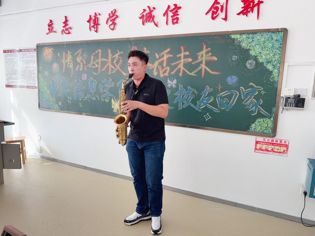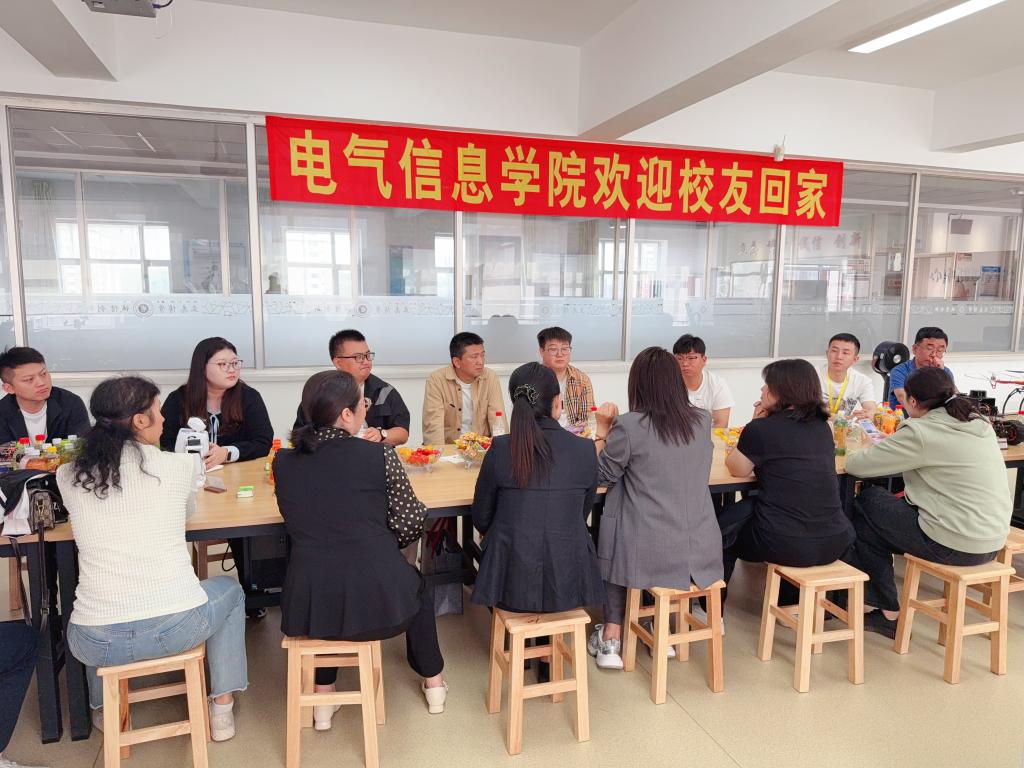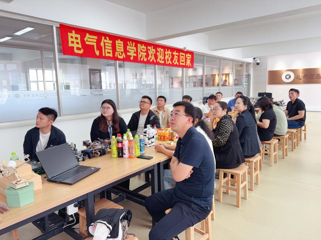 “情系母校,共话未来”校友茶话会在实验楼403室温馨举行。电气信息学院党总支副书记李艳、系主任、教师代表、辅导员与返校校友们欢聚一堂,共同观看学院宣传片。学生代表现场讲解科技作品,展现创新实力。辅导员关浩月萨克斯独奏《回家》深情悠扬,将现场气氛推向高潮。师生与校友畅谈学校和学院发展成就,回忆往日校园趣事,现场欢声不断、情意融融。