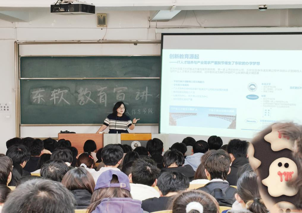 会上,杨雪老师详细介绍了东软教育科技集团的发展历程、全球业务与企业文化,重点阐述了校企合作的人才培养模式、行业人才需求及未来技术趋势,并鼓励同学们要夯实专业基础,积极参与实践创新,努力成长为支撑数字经济发展的高素质人才。
