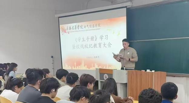 2025年10月11日,电气信息学院在英华楼318教室开展“《学生手册》学习及校规校纪教育”专题讲座,2025级全体学生参加。辅导员关皓月系统解读了《学生手册》中的核心条款,重点围绕课堂纪律要求、宿舍安全管理、日常行为规范等与学生密切相关的校规校纪内容展开讲解。他结合真实案例进行分析说明,引导学生深刻理解各项规章制度的内涵与意义,增强规则意识和纪律观念,自觉规范自身行为,为成长为文明守纪的优秀大学生奠定坚实基础。