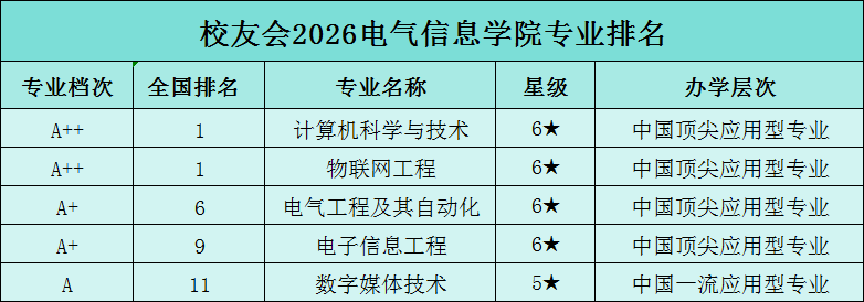 近日,艾瑞深校友会网发布2026中国大学专业排名,电气信息学院计算机科学与技术、物联网工程、电气工程及其自动化、电子信息工程4个专业同步获评六星级(6★)中国顶尖应用型专业,数字媒体技术专业获评五星级(5★)中国一流应用型专业。