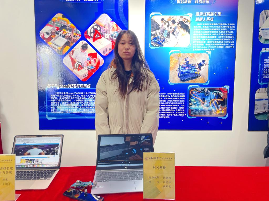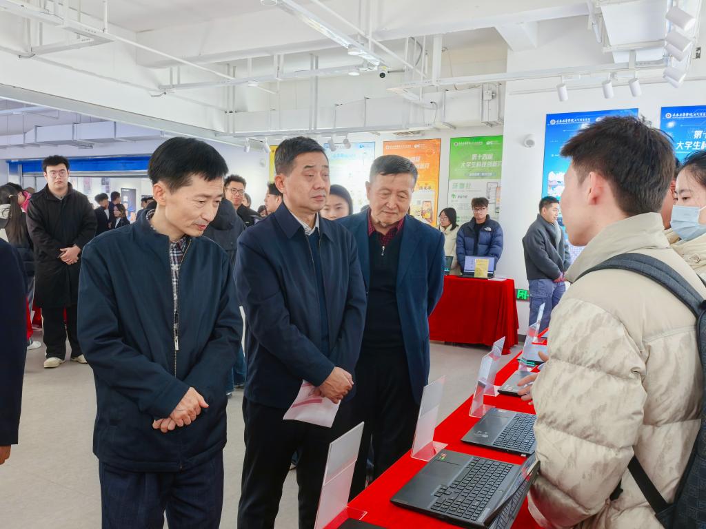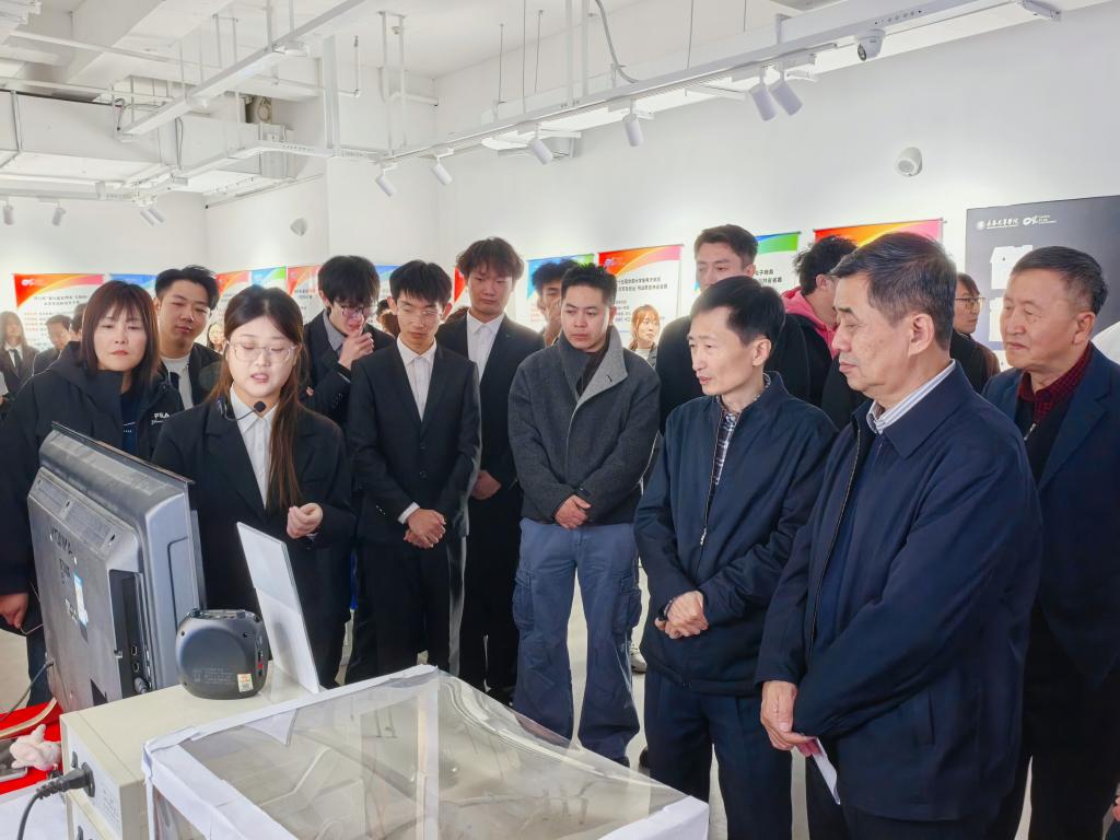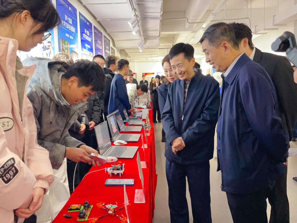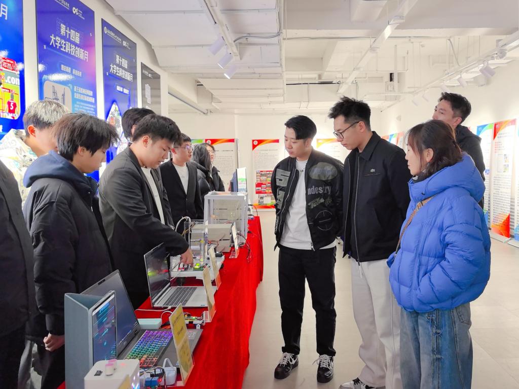 闭幕式结束后,校领导与师生一同前往科技作品展示区,参观了电气信息学院科技作品展。获奖学生代表围绕作品的设计思路、功能特点及应用前景进行了现场讲解。校领导和老师们就技术实现路径、后续优化方向以及成果转化潜力等方面与同学们展开交流,并提出了建设性意见。