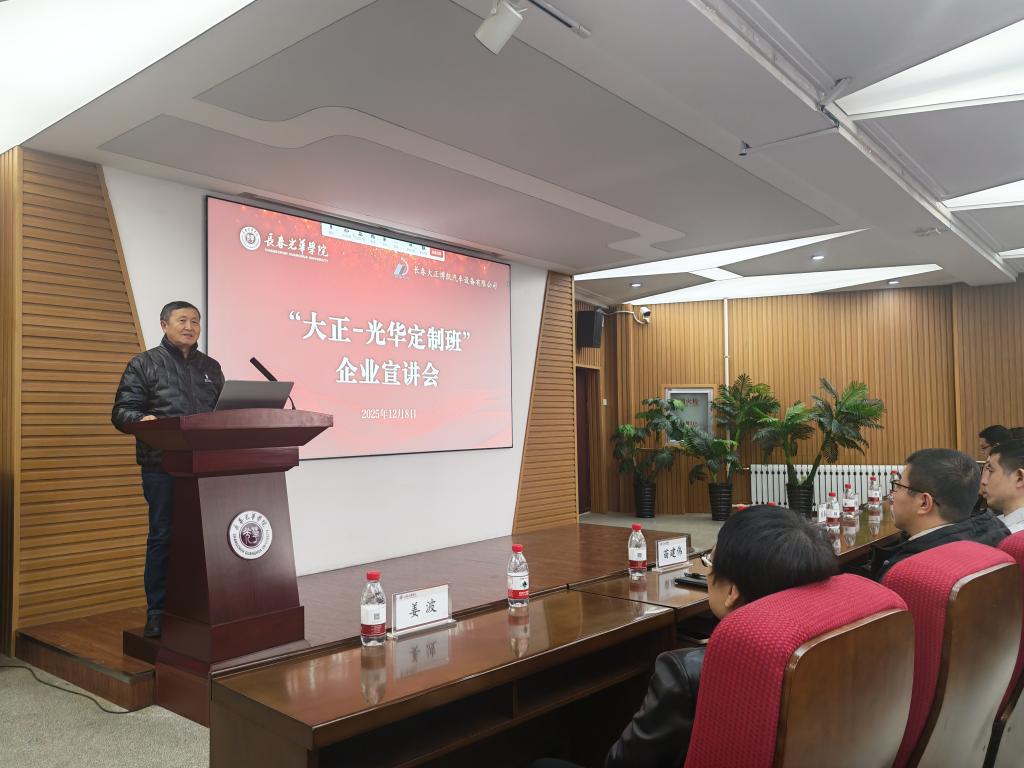 为深化产教融合、助力我省汽车产业发展,提升人才培养质量,进一步推动“大正-光华”定制班的建设工作,促进学生精准对口就业,2025年12月8日,我校与长春大正博凯汽车设备有限公司联合召开“大正-光华定制班”线上线下企业宣讲会。长春大正博凯汽车设备有限公司人力资源总经理刘春影、机械设计部经理单海东、仿真部经理刘晓娜、电气设计部经理张闯、人事主管葛艳,长春光华学院副校长栾学钢,机械工程学院院长杨卓娟、副院长姜波、副院长苗建伟、副书记王凯,电气信息学院副书记李艳等领导出席。机械工程学院、电气信息学院2026届全体毕业生及家长线上线下参加本次宣讲会。宣讲会由机械工程学院副院长姜波主持。